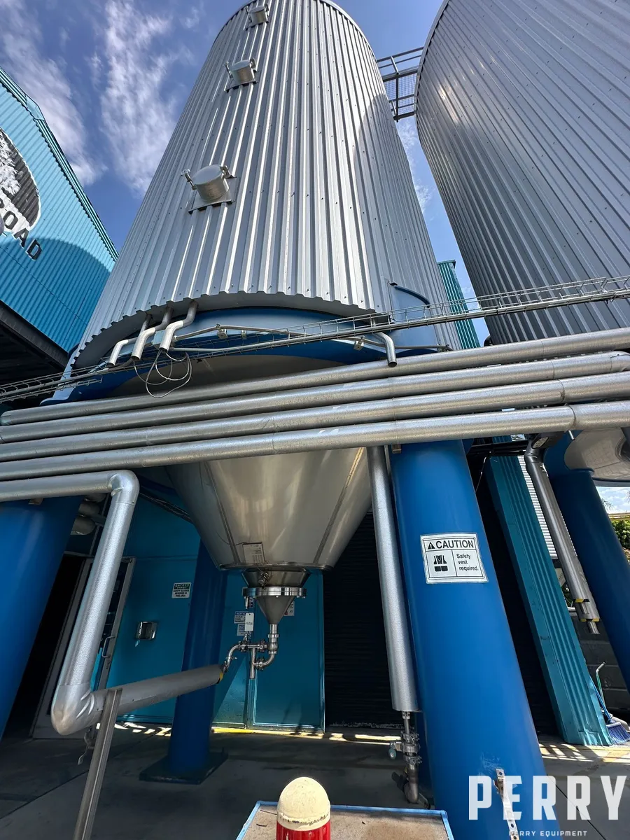 Used 27000 gallon (874 BBL) 304 stainless steel jacketed pressure vessel. Manufactured by Ziemann Bauer. Vessel Rated 29psi @86F, jacket rated 43psi @86F. 13' 7" dia x 42' tall. Dished head and bottom.Previously used in brewery as fermenter, cooled with Glycol @24F. National board #535. Serial #9619. Built 2015.