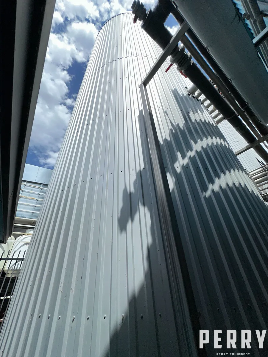 Used 27,000 gallon (874 BBL) 304 stainless steel jacketed pressure vessel. Manufactured by Ziemann Holvrieka. Vessel Rated 29psi @86F, jacket rated 43psi @86F. 13' 7" dia x 42' tall. Dished head, cone bottom.Previously used in brewery as fermenter, cooled with Glycol @24F. National board #723. Serial #300785. Built 2018.