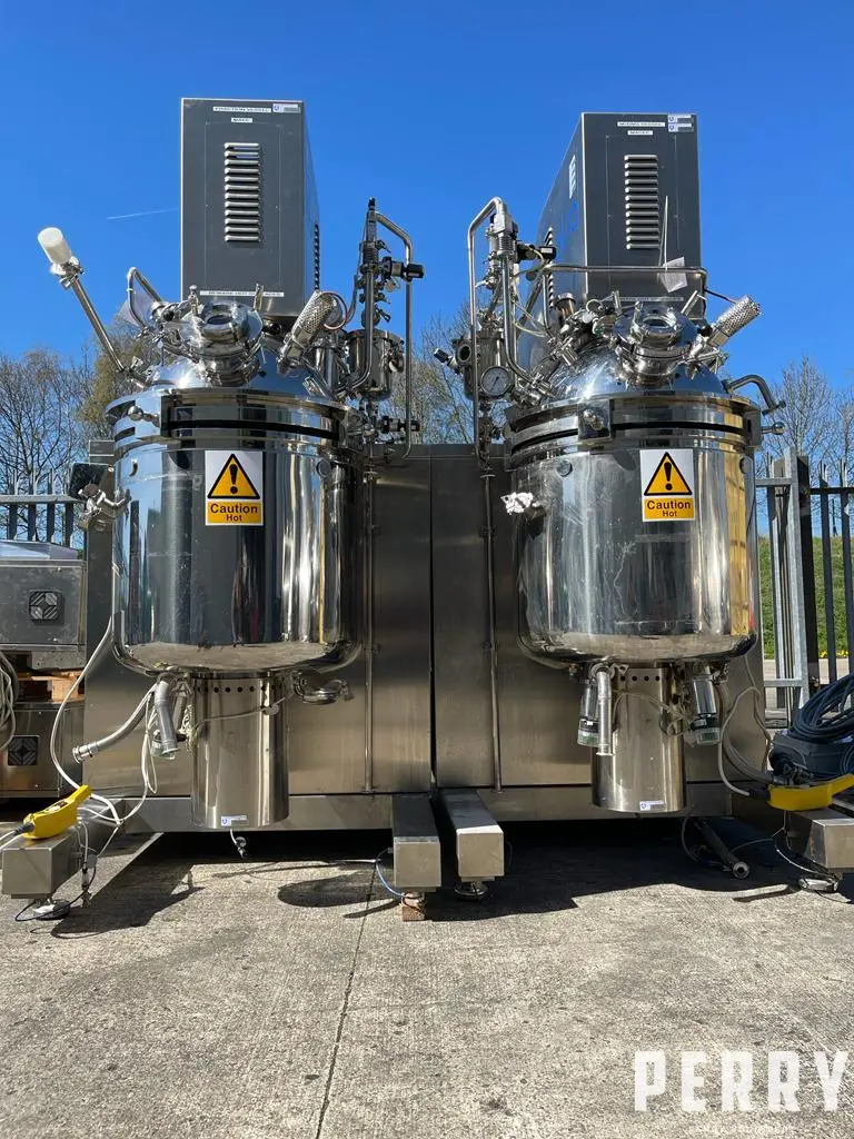 2 mixers sous vide en acier inoxydable 316 poli miroir de qualité pharmaceutique Olsa. Élévation/abaissement entièrement hydraulique avec panneaux électriques, commandes PLC à écran tactile, pompes CIP, pompes à membrane pour décharge de produit, les deux cuves équipées d’un système à cellule de charge. Manuels/dessins inclus. Spécifications techniques ci-dessous pour chaque cuve principale du processus.