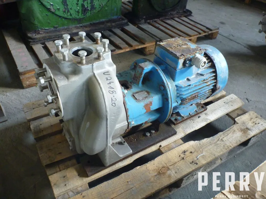 Pompe centrifuge auto-amorçante d'occasion de Johnson Pump/SPX, type FRES 80-170 R6MQ1. Pièces en contact conçues en acier inoxydable. Diamètre d'entrée 80 mm, sortie 75 mm. La pompe est entraînée par un moteur électrique de 11 kW, 2900 tr/min, 50 Hz. La pompe délivre un débit de 35 m³/heure sous une hauteur manométrique de 36 m, jusqu'à 97 m³/heure sous une hauteur de 12 m. La documentation technique n'est pas incluse.