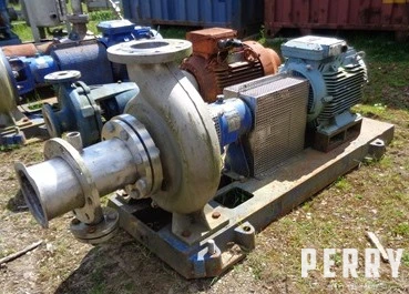 Pompe centrifuge en acier inoxydable KSB d'occasion modèle CPK-R 125-315. Entrée de 150 mm de diamètre et sortie de 125 mm de diamètre. Hydraulique entraînée directement par un moteur de 22 kW, 400 volts, 3 phases/50 Hz, 1470 tr/min, avec une vitesse maximale de 1500 tr/min. Montée sur une plaque de base.