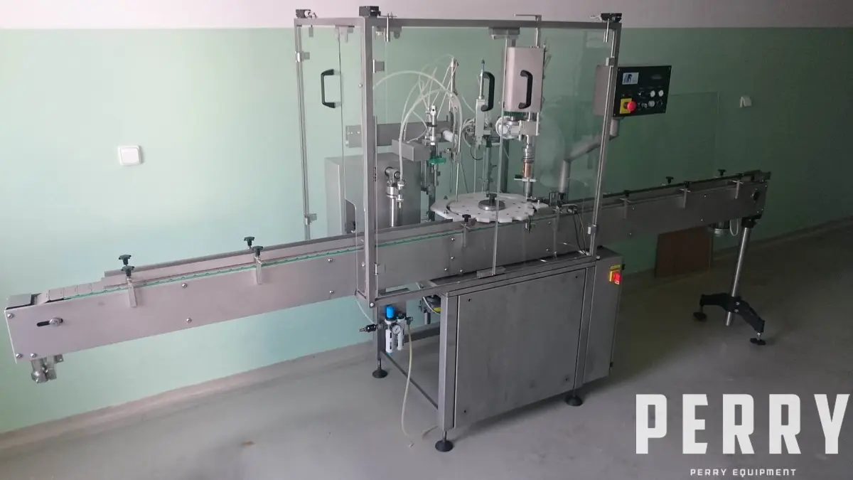 Używana automatyczna napełniarka do cieczy AMPI (dostawca) model MOKA 12 PU. Napełniarka przeznaczona jest do napełniania cieczy do małych szklanych butelek o cylindrycznym kształcie, a następnie ich zamykania. Urządzenie składa się z: modułu MOKA z karuzelą, jednostki napełniającej z (2) stanowiskami napełniania, stanowiska do zakładania i uszczelniania nakrętek, przenośnika wibracyjnego do nakrętek. Wydajność pracy wynosi 10-30 szt./min. Maksymalna objętość napełniania to 210 ml. Wymiary szklanych butelek: średnica 20-50 mm, wysokość 50-100 mm. Całkowite wymiary maszyny: 2500 x 1300 x 1700 (wysokość) mm.