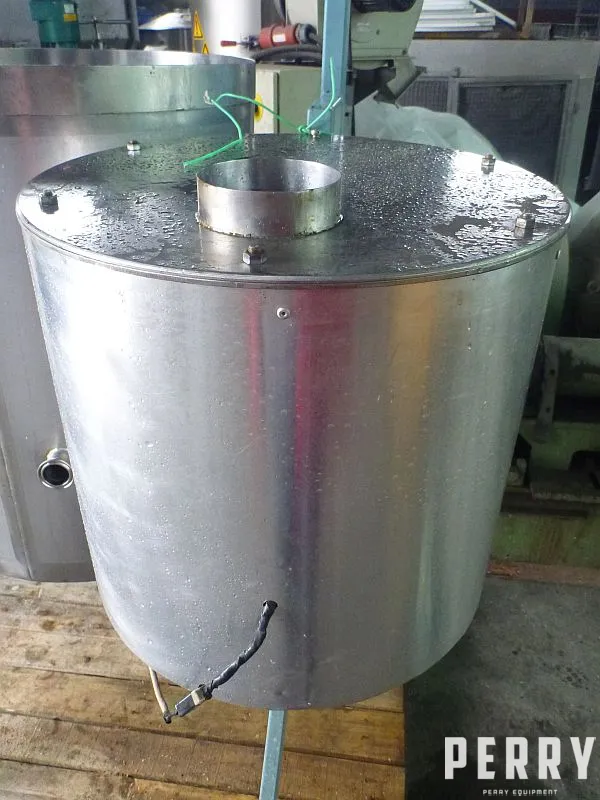 Używany pionowy zbiornik magazynowy ze stali ko z grzałkami elektrycznymi. Zbiornik ma wewnetrzne wymiary: srednica 355 mm x głebokosc 320 mm. Robocza pojemnosc 30 l. Centralny dolny spust z zaworem. Gora przykrecana.