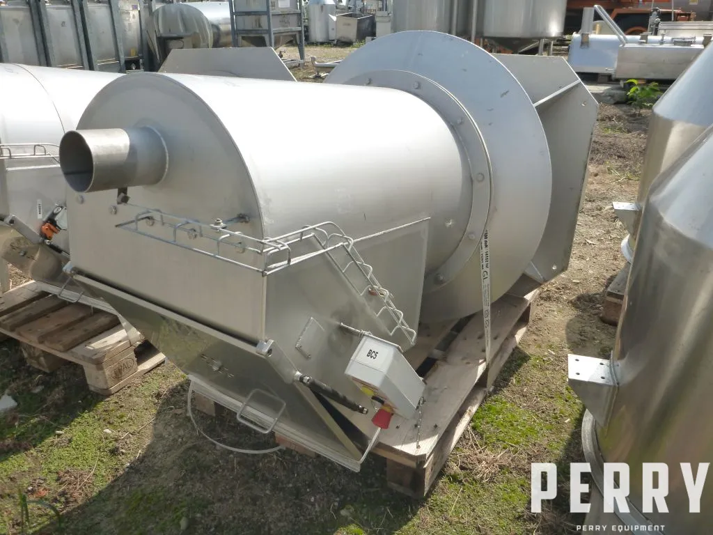 Używany pionowy silos/zbiornik zasypowy sypkich, o całkowitej pojemności 600 l. Zbiornik ma wymiary zasypu 550 mm x 590 mm, zasyp jest zamykany klapą unoszoną ręcznie. Posiada również w górnej części przyłącze o średnicy 100 mm. Zbiornik stożkowy. Wysyp dolny, o średnicy 160 mm. Zbiornik jest zamontowany na płycie nośnej wykonanej ze stali kwasoodpornej. Urządzenie ostatnio pracowało w przemyśle spożywczym.