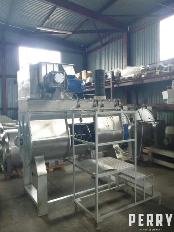 Używany kwasoodporny mieszalnik wstęgowy produkcji Consumasz (Polska) typ M-01 o pojemności całkowitej 1100 l. Pojemność robocza 850 l. Komora mieszania ma wewnętrzne wymiary: długość 1990 mm, szerokość 830 mm, głębokość 1175 mm. Zasyp przez sito cylindryczne produkcji Consumasz model PC-400, napędzane przez przekładnię silnikiem elektrycznym o mocy 4 kW, 1445 obr/min, 220/380 V, 50 Hz, lub bezpośrednio przez otwór zasypowy o wymiarach 205 mm x 205 mm. Mieszalnik posiada pojedynczy wał, wyposażony w dwie przyspawane wstęgi. Wał jest napędzany przez przekładnię silnikiem elektrycznym o mocy 15 kW, 1460 obr/min, 380 V, 50 Hz. Redukcja na przekładni i=36,9. Robocze obroty wału do 39 obr/min. Maszyna na ścianie bocznej posiada właz inspekcyjny o wymiarach 540 mm x 365 mm, zamykany przykręcaną klapą ze stali KO. Otwór wysypowy, centralny, o średnicy 200 mm, wyposażony w ręcznie otwierany zawór klapowy. Produkt spada do leja rozładunkowego przenośnika ślimakowego. Ślimak o średnicy 200 mm, robocza długość przenośnika 1000 mm. Zapotrzebowanie mocy na przenośniku ślimakowym 1.1 kW. Mieszalnik jest zamontowany na ramie nośnej ze stali węglowej. W zestawie z mieszalnikiem jest panel sterowania oraz platforma robocza wraz ze schodami. Maszyna pracowała w przemyśle spożywczym.