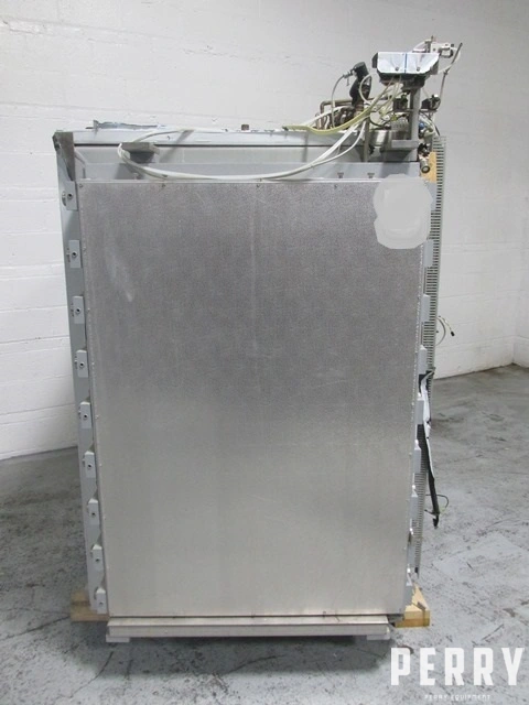 Używany autoklaw Getinge model 91415. Powierzchnie kontaktu z produktem ze stali nierdzewnej. Konstrukcja dwustronna przechodnia z pneumatycznym zamknięciem drzwi, objętość komory 2010 litrów. Komora o wymiarach około 870 mm szerokości x 1450 mm wysokości x 1540 mm długości, przystosowana do pracy przy ciśnieniu 45 psi oraz pełnej próżni w temperaturze 300°F. Płaszcz grzewczy przystosowany do ciśnienia 45 psi oraz pełnej próżni w temperaturze 300°F. Zespół próżniowy z pompą próżniową i wymiennikiem ciepła płytowym.