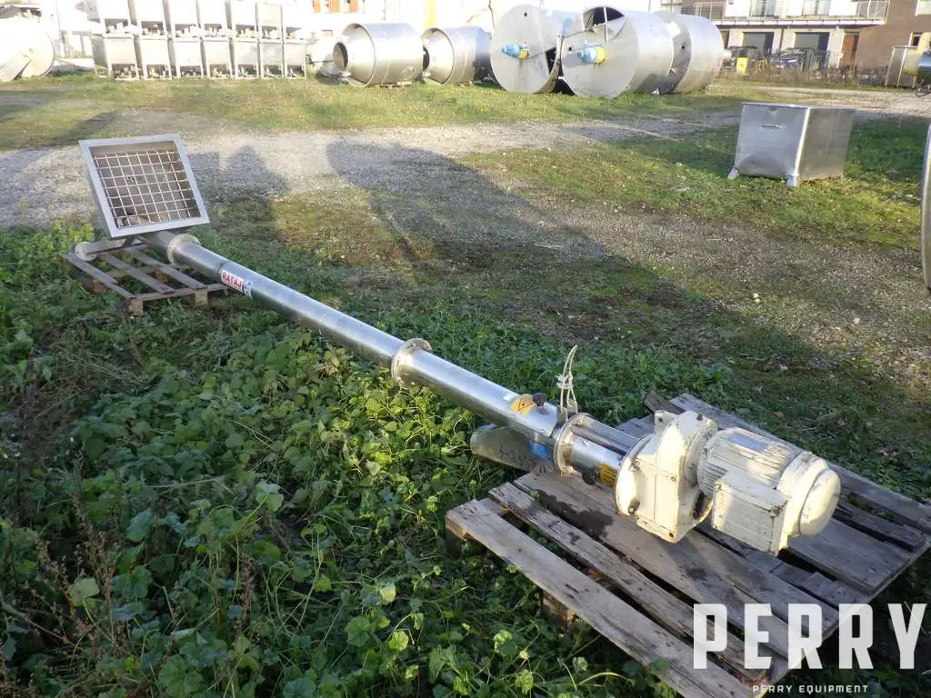 Używany przenośnik ślimakowy typu "O" produkcji Rataj typ RLN 110 (Czechy). Wykonanie ze stali kwasoodpornej. Ślimak ma średnicę 110 mm x skok 110 mm. Robocza długość przenoszenia 3100 mm, całkowita długość 4560 mm. Ślimak jest napędzany przez przekładnie silnikiem elektrycznym o mocy 2,2 kW, 1425 obr/min, 380-420 V, 50 Hz. Robocze obroty ślimaka do 42 obr/min. Lej zasypowy ma wymiary 500 mm x 500 mm. Wlot do ślimaka ma wymiary 130 mm x 120 mm. Wysyp ma średnicę 130 mm. Ostatnio pracował w przemyśle spożywczym.
