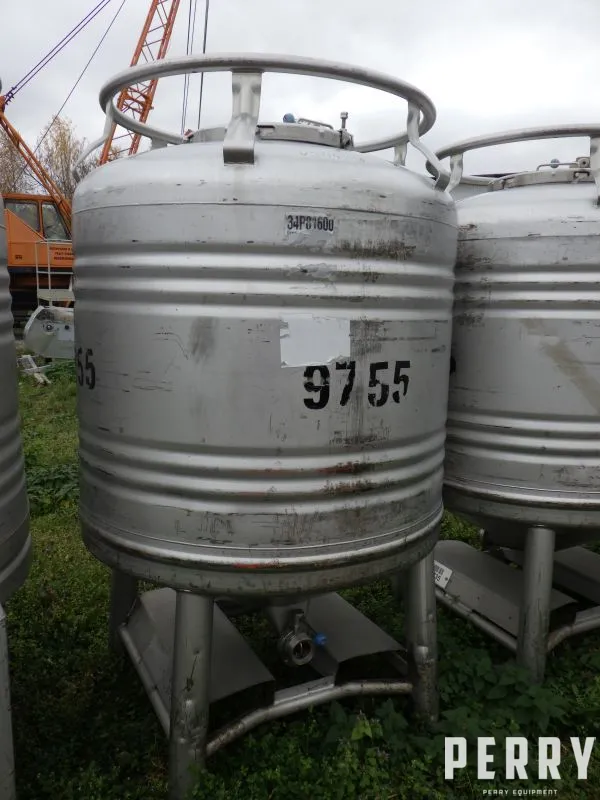 Używany pionowy zbiornik magazynowy ze stali kwasoodpornej. Całkowita pojemność 800 l. Zbiornik ma wewnętrzną średnicę 1000 mm x 890 mm długości prostej linii ściany. Góra spawana, posiada centralny właz inspekcyjny o średnicy 400 mm, wraz z pokrywą. Dennica stożkowa, z centralnym otworem spustowym wyposażonym w ręcznie otwierany zawór. Zbiornik jest zamontowany na 4 nogach ze stali ko i posiada dwie szyny do pracy z wózkiem widłowym. Zbiornik ostatnio używany w przemyśle spożywczym.