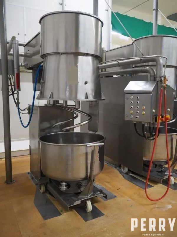 Używany mieszalnik planetarny produkcji Grieser (DE) model VPL 350. Mieszalnik posiada dwa mieszadła spiralne i jedno obcierające ściany boczne. Mieszadła są napędzane silnikiem el. 15 kW, 1460 obr/min, 400 V, 50 Hz, przez przełożenia pasowe i przekładnię planetarną. Unoszenie i opuszczanie mieszadeł hydrauliczne. Mieszalnik jest wyposażony w 9 przejezdnych kadzi ze stali ko. Każda kadź ma wewnętrzne wymiary 695 mm x 500 mm głębokości, całkowita pojemność 365 l, robocza ok 350 l. Dwie z kadzi mają w dennicy otwory spustowe wyposażone w zawory otwierane ręcznie. W zestawie znajduje się również mechaniczna wywrotnica do unoszenia i rozładunku kadzi przez przechył. Mieszalnik posiada lokalny panel sterowania i szafkę elektryczną. Dokumentacja techniczna - ogólny podręcznik użytkownika i schematy el, w formie cyfrowej. Maszyna obecnie zdemontowana. Ostatnio pracowała w przemyśle spożywczym.