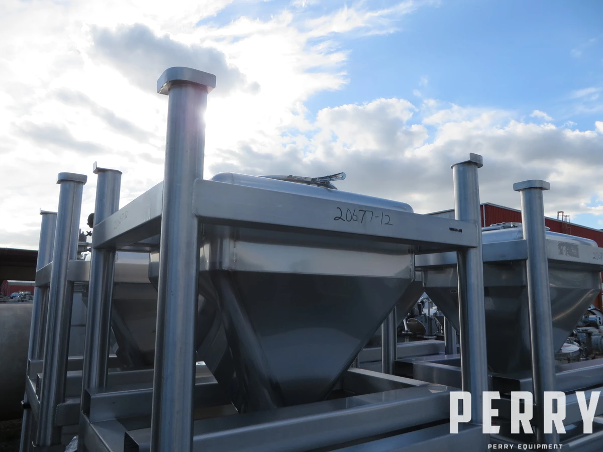 Recipient folosit Inc. butoi din oțel inoxidabil de aproximativ 90 de galoane. Dimensiuni 36" X 30" X 13" cu laturi drepte, având un con de 25" și o descărcare de 10". Montat pe un cadru accesibil cu stivuitor, stivuibil. Deschidere superioară pentru acces de 18".