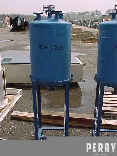 Rezervor vertical din fibră de sticlă folosit, capacitate 18 galoane, aproximativ 16" diametru X 24" lungime pe linear, cu capace bombate sus și jos. Ieșirea este o flanșă de 1". Partea de sus are (4) flanșe de 1". Rezervorul este așezat pe un suport din oțel înalt de 31" de la ieșirea inferioară.