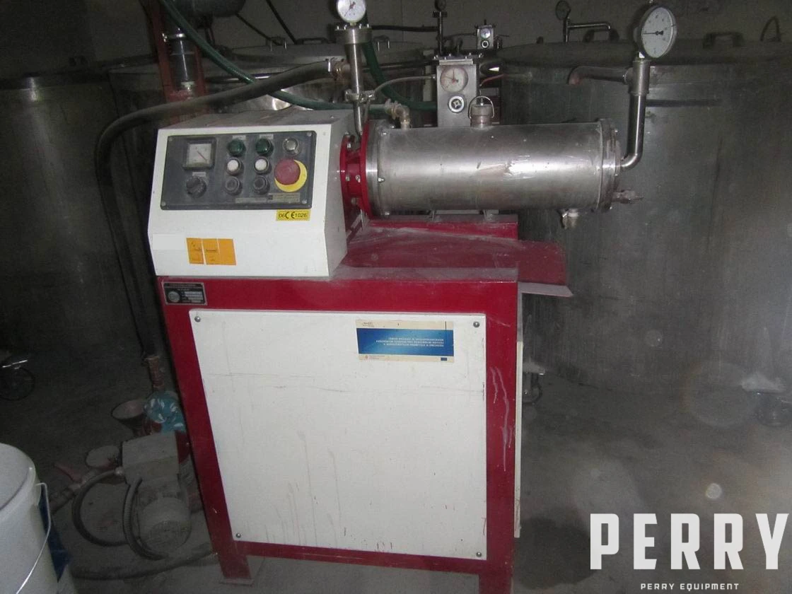 Moară orizontală cu bile PerryMix (Republica Cehă) model SPD-7, puțin utilizată. Camera cu înveliș din oțel inoxidabil are o capacitate de 7 litri. Sigiliu mecanic pe arbore. Mașina este acționată de un motor electric de 10 kW. Include pompă de alimentare. Panoul de control este inclus.